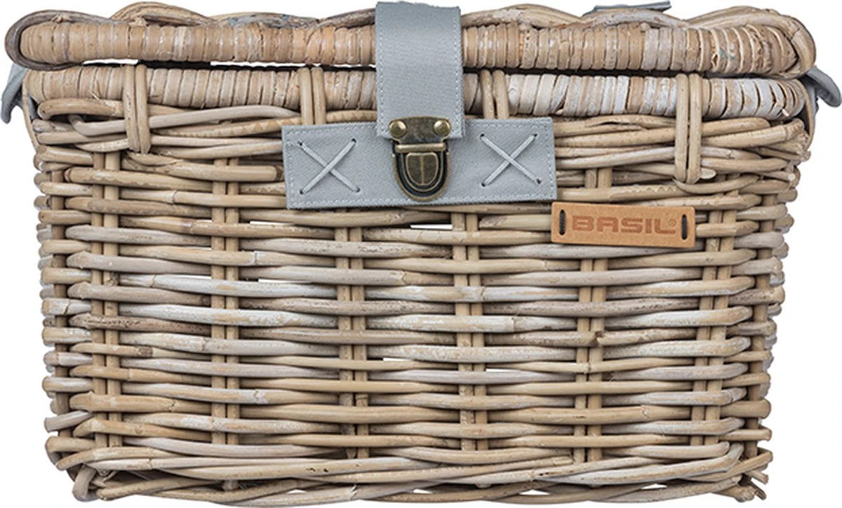 De Basil Denton M is een luxe rotan opbergmand voor op een dames- of herenfiets en bovendien voorzien van een deksel met sluiting. De mand valt direct op vanwege de grijze kleur en een diversiteit aan details. Deze praktische opbergkoffer is een aanwinst voor het doen van je dagelijkse boodschappen of voor het vervoeren van je sporttas. De mand komt ook goed van pas bij een heerlijke picknick. Ideaal tijdens een fietsvakantie in de lente of bij mooi zomerweer. Het is een stijlvolle mand waarmee je zeker gezien mag worden. De handgrepen en kunstlederen details geven de koffer een luxe uitstraling. Deze rotan fietsmand wordt geleverd zonder bevestigingsmateriaal, maar kun je monteren op de voordrager van je fiets in combinatie met een crate mounting set die apart dient aan te schaffen. De leren handvatten maken het mogelijk om de fietsmand overal mee naartoe te nemen. Wil je een exclusieve rotan fietsmand van goede kwaliteit? De Basil Denton M is zeker een slimme keuze. Bekijk ook zeker de andere opbergkoffers en fietsmanden van het merk Basil. De mand is gemaakt van natuurlijk rotan materiaal. Hierdoor heeft de mand niet alleen een mooie uitstraling maar is deze ook nog eens milieuvriendelijk, licht van gewicht en toch sterk. Wij kiezen voor de beste biologische soorten rotan en wilgenteen soorten maar het blijft een natuurproduct. Dit betekent dat het materiaal gevoelig is voor weersinvloeden. Daarnaast kunnen de afmetingen van de mand 1 – 2 cm variëren. Binnenmaat L 36 x B 23 x H 20 cm Buitenmaat L 39 x B 27 x H 25 cm Eigenschappen: De rotan fietsmand monteer je eenvoudig op je fiets met een crate mounting set. De mand heeft een luxe uitstraling dankzij de kunstlederen details. Deze praktische opbergkoffer komt voor diverse doeleinden goed van pas en is daarom ideaal voor zowel mannen als vrouwen. Het deksel met sluiting voorkomt dat je spullen of boodschappen op straat komen te liggen. Je vervoert daardoor altijd veilig je bagage.