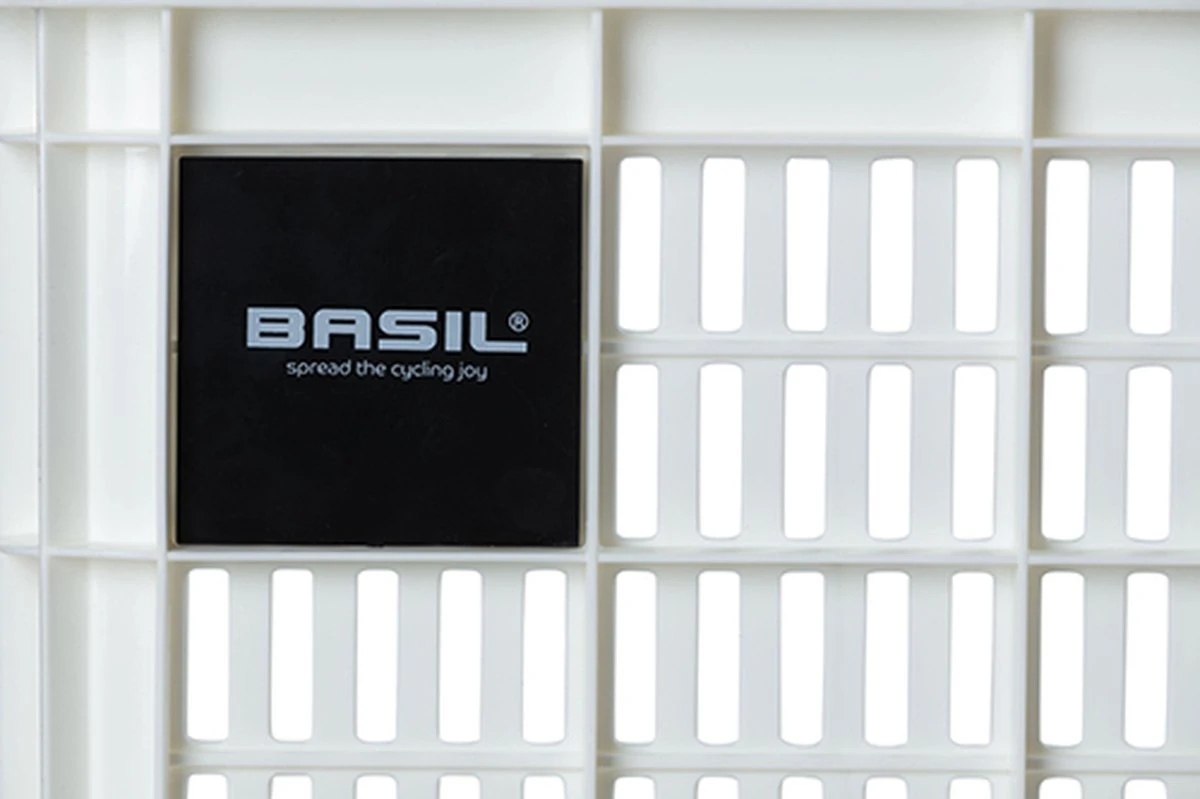 De Basil fietskrat in de maat M is een witte fietskrat voor op een dames- of herenfiets. De fietskrat is gemaakt van duurzaam materiaal en heeft een inhoud van 29,5 liter.