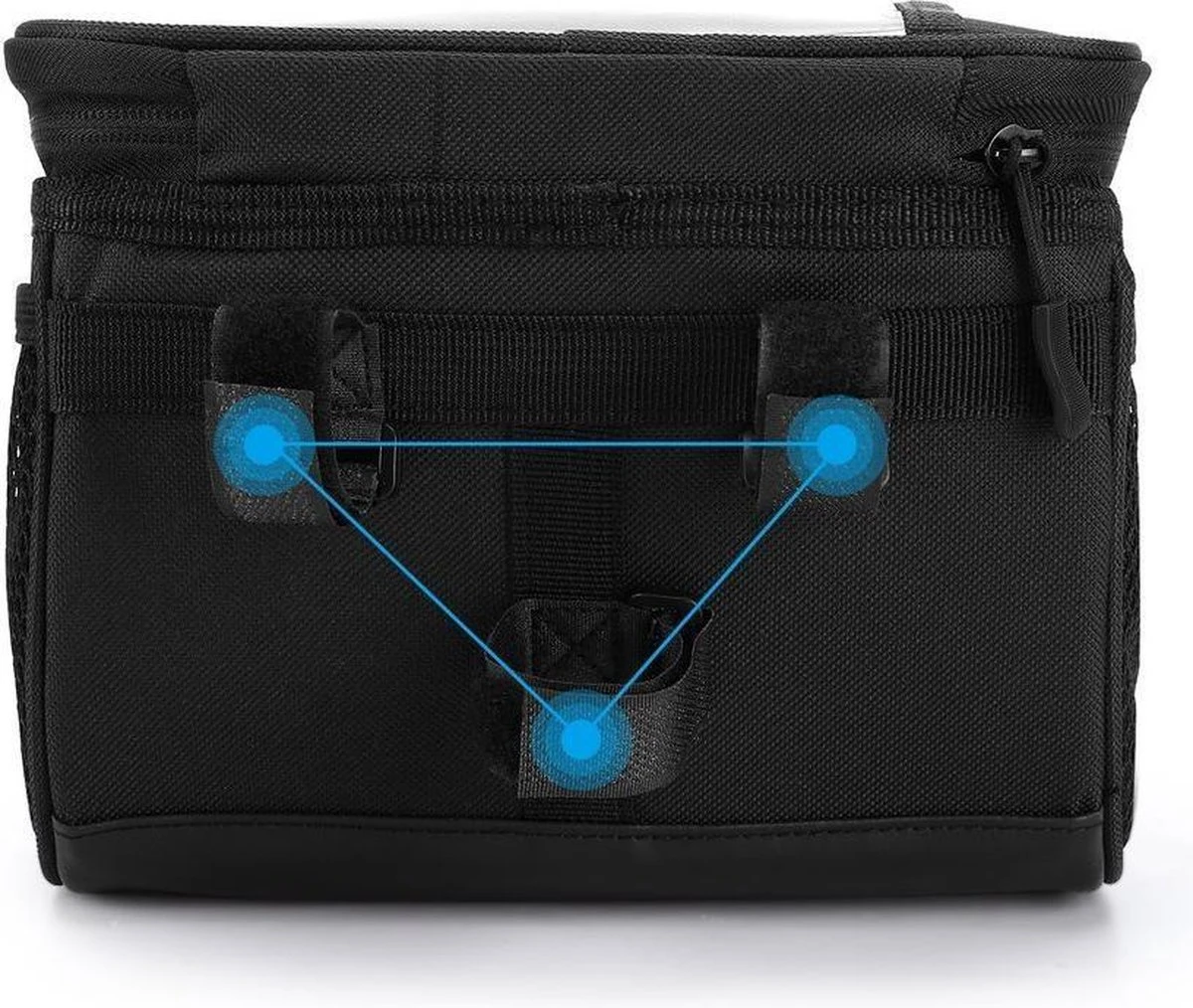 Om de tas aan het stuur te bevestigen, zijn er gewoon drie klittenbandsluitingen – zonder gereedschap of tijdrovende activiteiten kunt u hem snel en gemakkelijk installeren of verwijderen tijdens een stop.