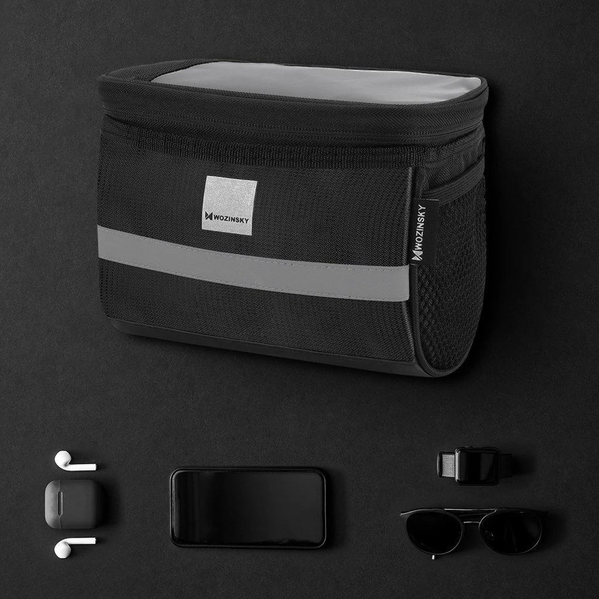 In deze stuurtas fiets kun je gemakkelijk veel spullen opbergen: sleutels, portemonnee, koptelefoon, handschoenen. Het heeft een hoofdvak met ritssluiting van 2 liter en een extra extern gaasvak.