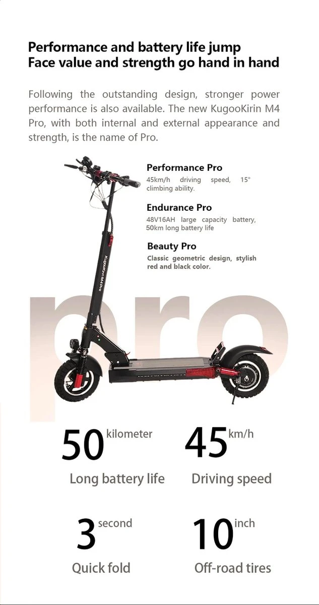 De Kugoo Kirin M4 Pro is een elektrische step met een bereik van 65km en wielen van 10 inch. Gemakkelijk stel je snelheid van de drie versnelling in en daarna geef je gas en zo verplaats je je snel van A naar B.