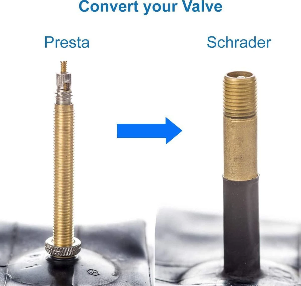 - Wees voorbereid: De meeste mountainbikes of racefietsen hebben Presta banden, de meest voorkomende luchtpompen hebben echter een Schrader mondstuk. De ventieladapters zijn compact en licht van gewicht, waardoor ze gemakkelijk mee te nemen zijn. Super licht van gewicht. Slechts: 3 gram