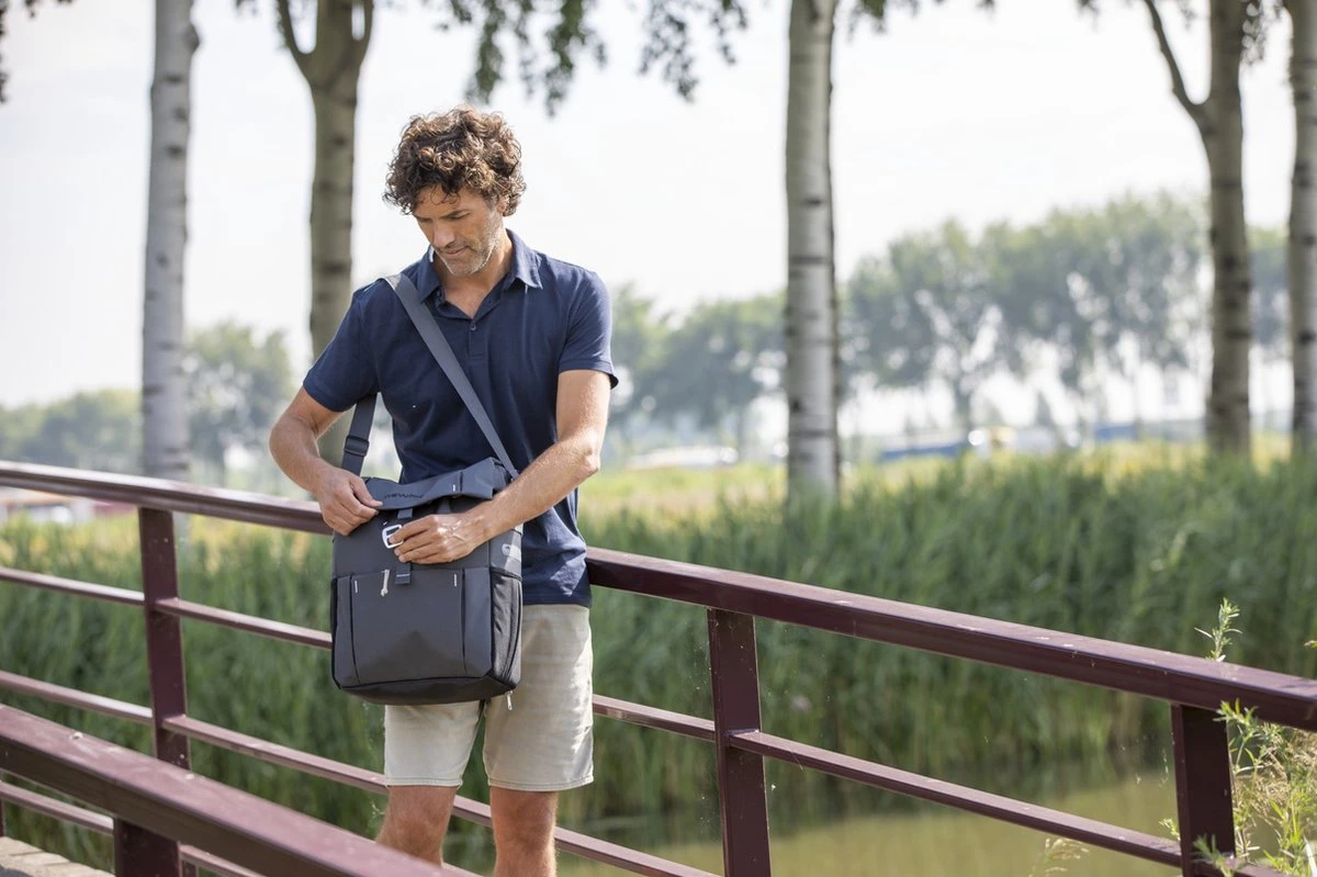 Sportieve enkele fietstas met schouderband, ook geschikt voor E-Bike en waterdicht dankzij meegeleverde regenhoes.