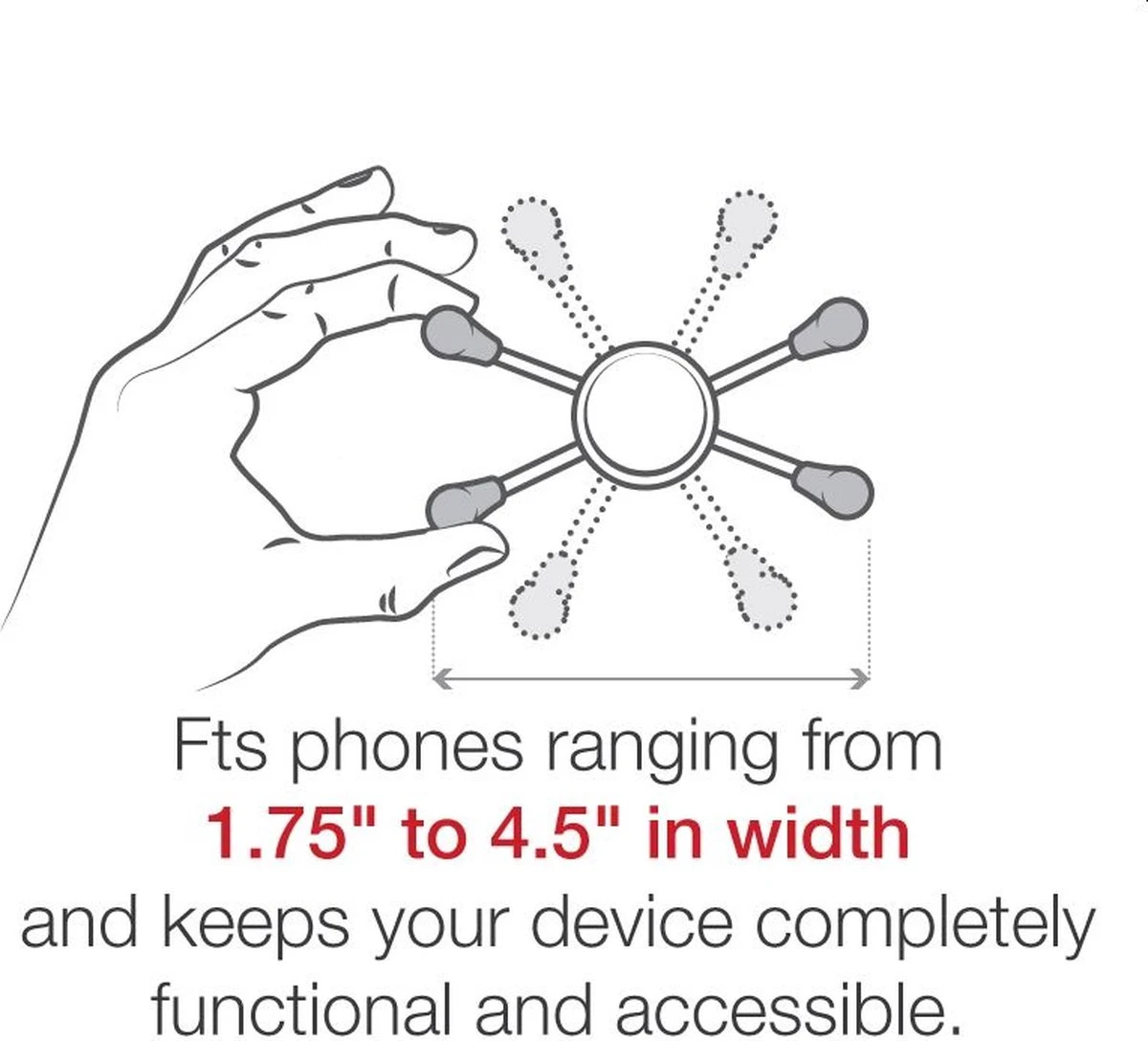 De universele X-Grip® is geschikt voor de meest voorkomende 5 tablets en smartphones. Controleer de afmetingen aan de hand van onderstaande gegevens. Door het slimme ontwerp met de vier verende armen met rubberen tips, blijft je tablet zelfs onder zware omstandigheden perfect op zijn plaats.