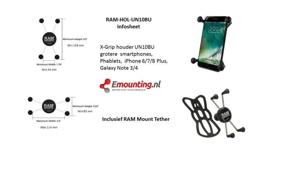 | Verpakkingsinhoud | – RAM X-Grip Large Telefoonhouder – Ball Size B – RAM-HOL-UN10BU – Secure Band |
